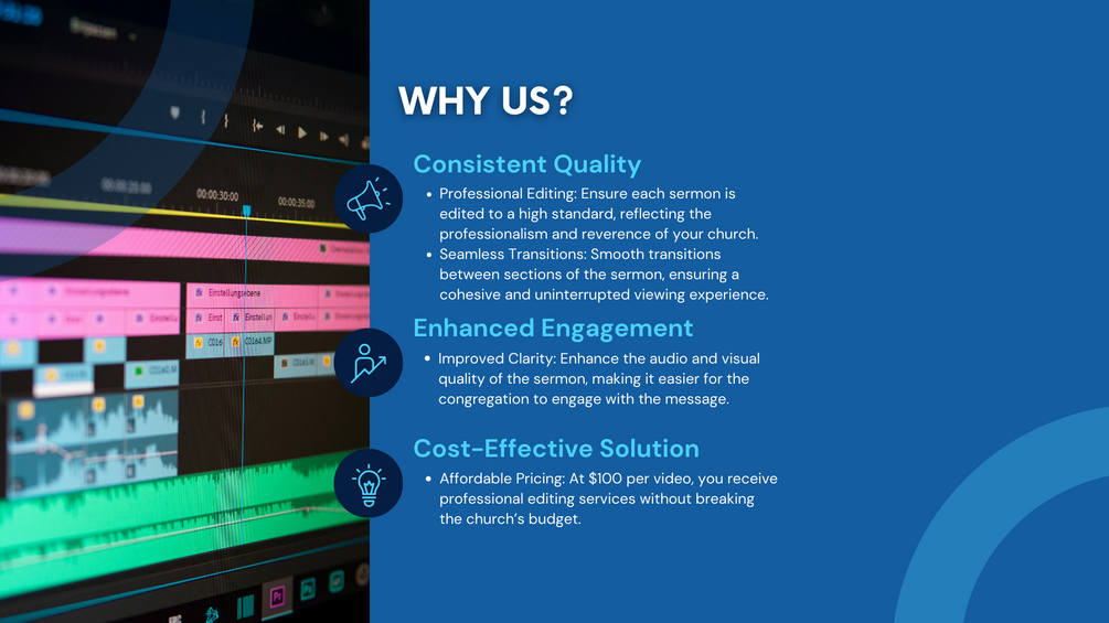Welcome to our professional sermon video editing service, where we specialize in enhancing your sermons to ensure they are delivered with clarity, impact, and reverence. Whether you're a pastor, church leader, or religious organization, our editing services will help you connect with your congregation more effectively, both in-person and online.